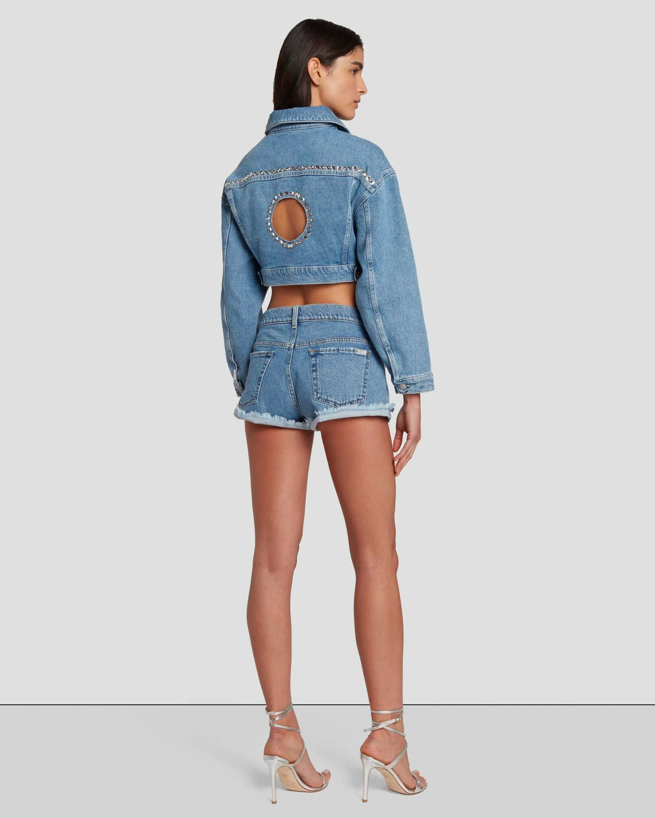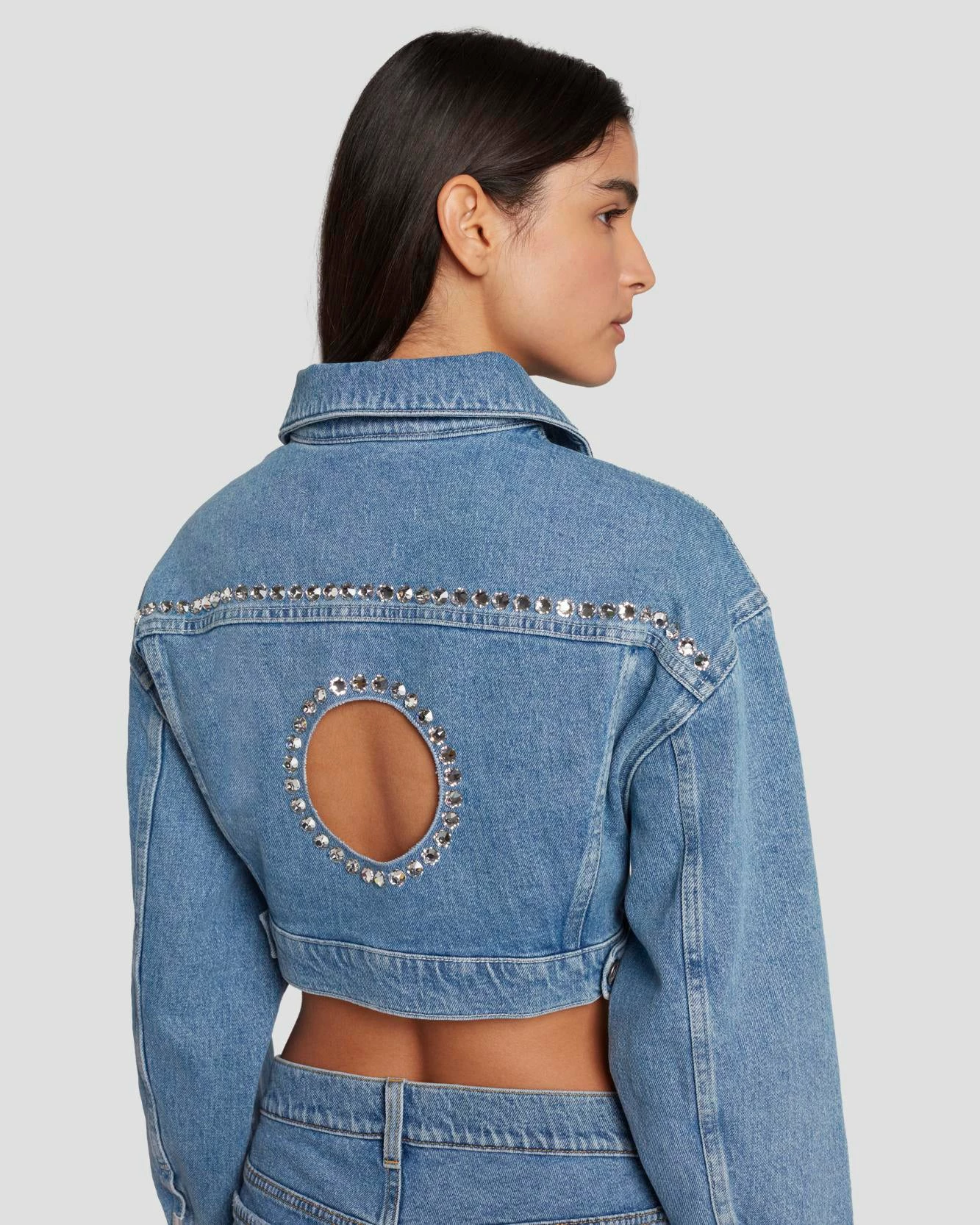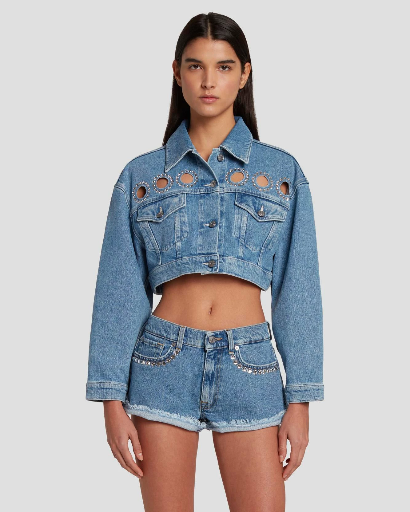 Fashion editor/style icon Anna Dello Russo brings Haute Couture edge to 7 For All Mankind in this exclusive, limited-edition denim collection featuring crystal embellishment and stylish cutouts. The ultimate statement in Y2K glamour, this cropped trucker jacket stands out with Swarovski embellished cutout circles on the front yoke as well as a large cutout and other crystal embellishment on the back. This is a women’s jean jacket that is made from our well-loved comfort denim with just the right amount of stretch.