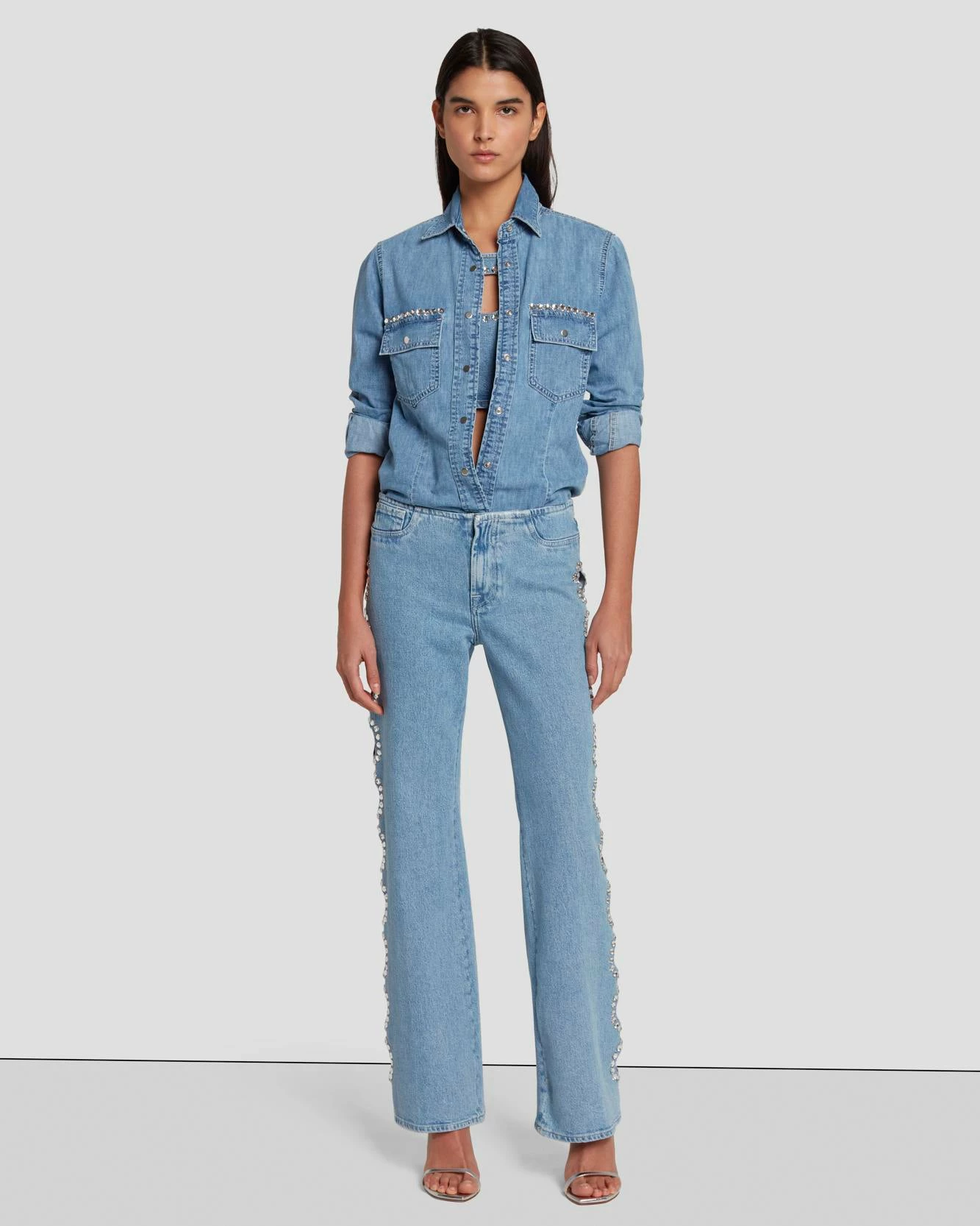 Fashion editor/style icon Anna Dello Russo brings Haute Couture edge to 7 For All Mankind in this exclusive limited-edition denim collection featuring crystal embellishment and stylish cutouts. This pair of women’s jeans features a low rise, cropped waistband, and slightly slouchy bootcut silhouette. These haute jeans are bringing back Y2K glamour.