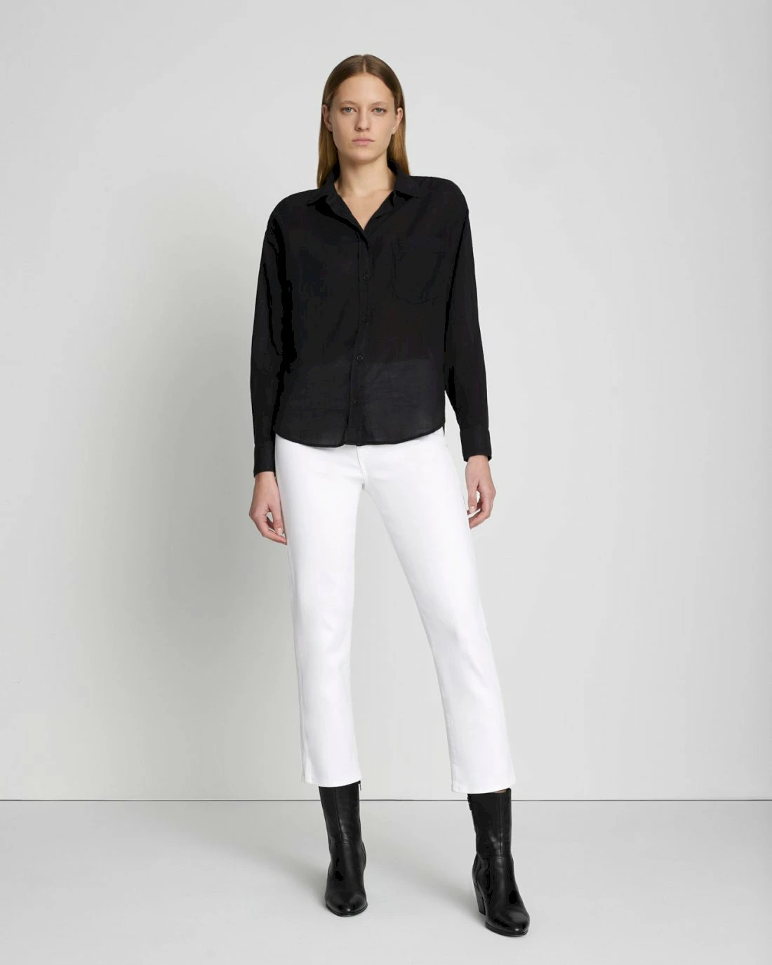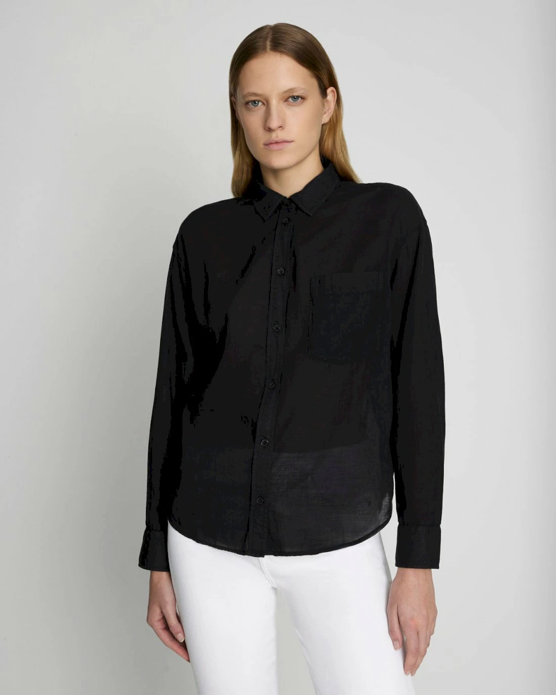 A feminine take on the classic button-up shirt with all of the polish and none of the fuss. Made from lightweight Pima Cotton Voile, this slightly sheer collared women’s button-down has a relaxed fit and features subtle star embroidery, a slightly dropped shoulder, and a patch pocket at the chest. This is a classic shirt with a stylish twist that will polish off denim or be the perfect complement to any pant.