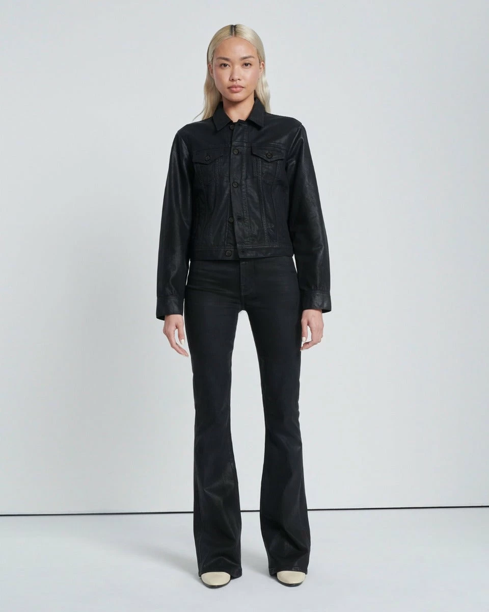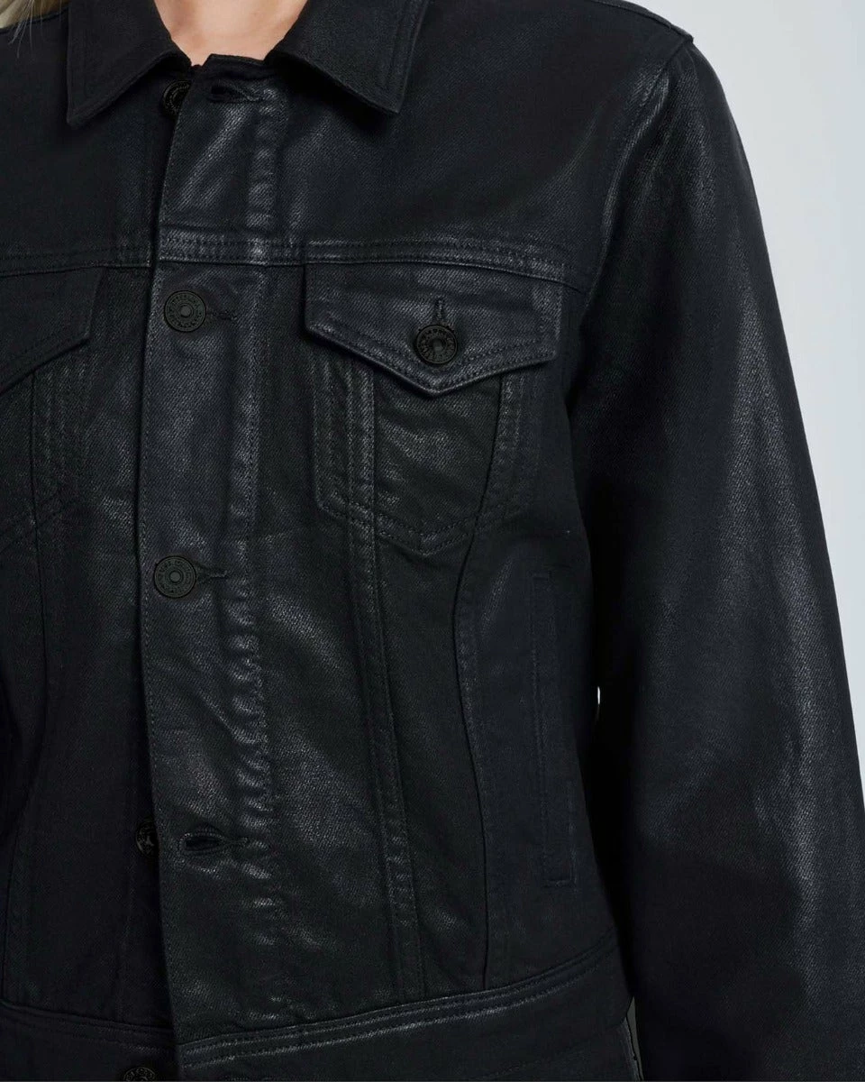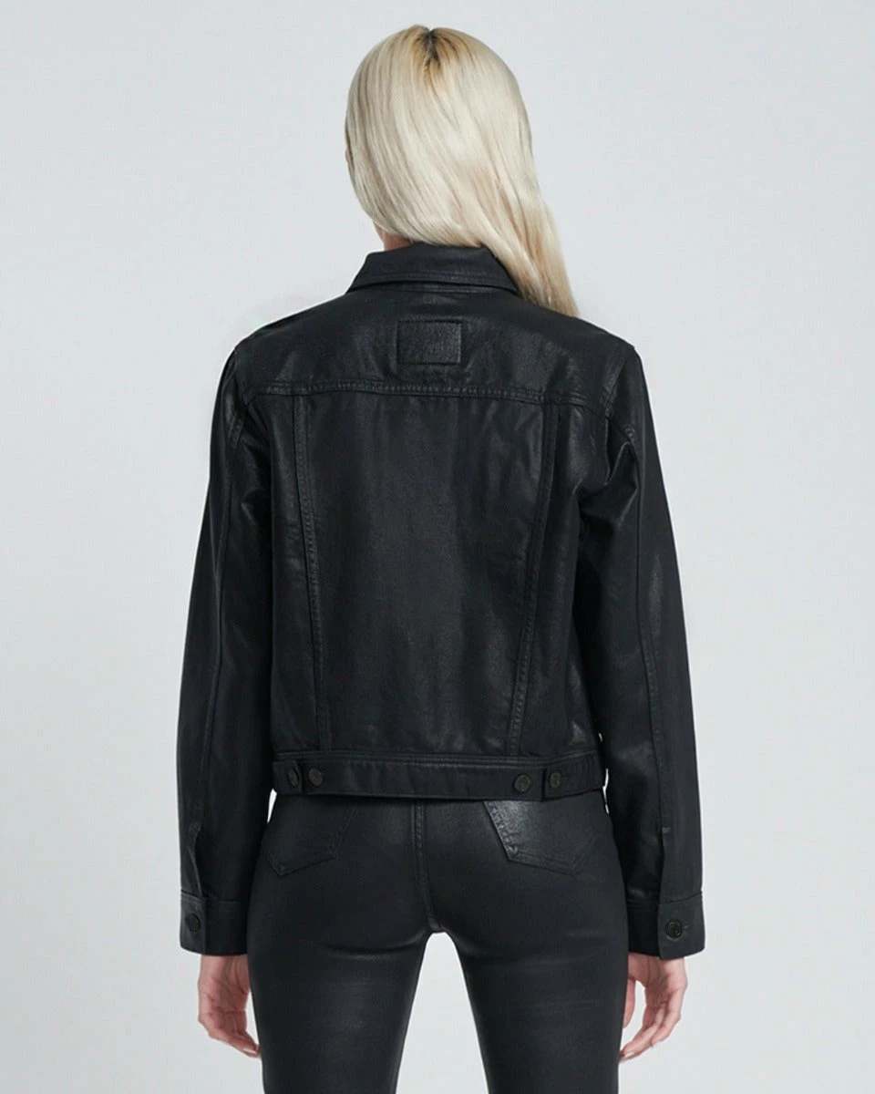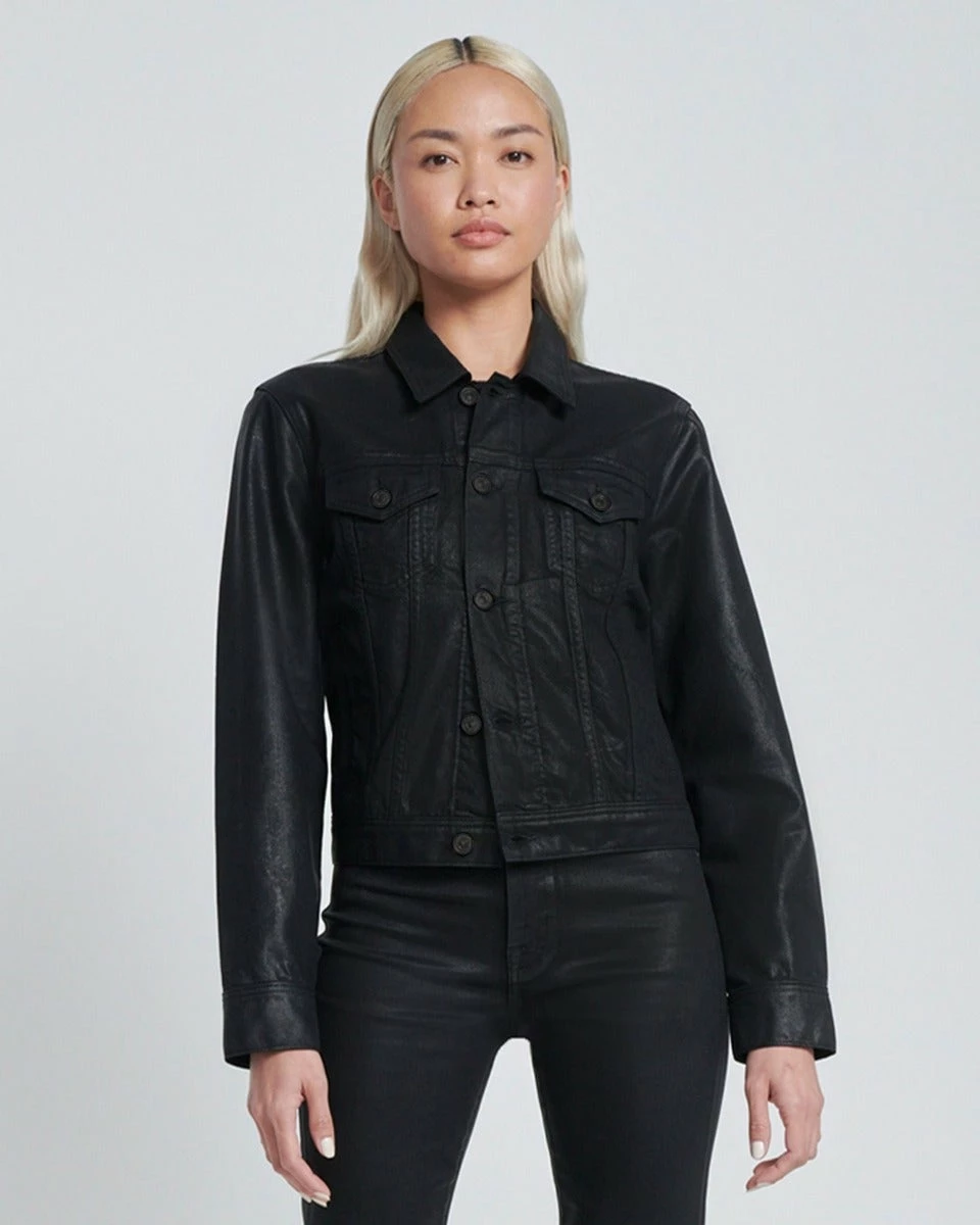 A true essential for fall. This coated version of our well-loved Classic Trucker jacket offers a leather-like edge to denim dressing. Top over the Bow-Tie Pant for a slick denim-on-denim pairing.