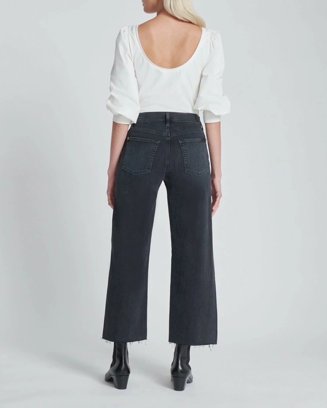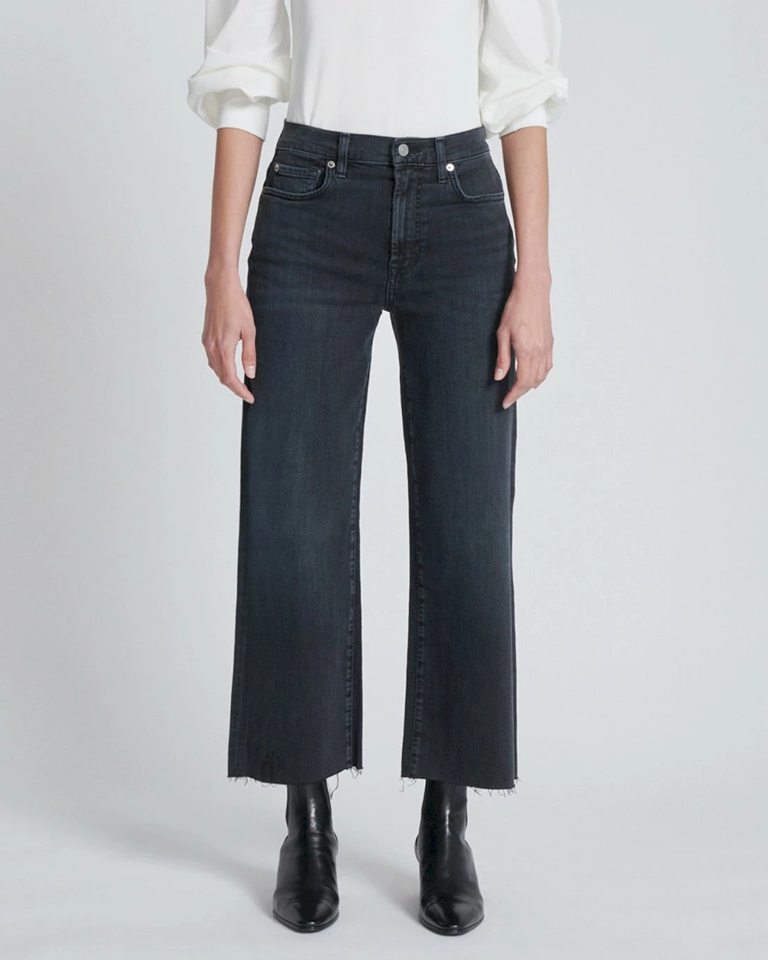 Our signature cropped wide-leg jean is done in a simple black wash with barely-there whiskering. Cut from premium stretch denim, this pair is topped with a mid-rise waist and finished with a raw cut hem for a vintage-inspired vibe. Elevate them even more with a sheer button-up blouse or a fitted bodysuit.