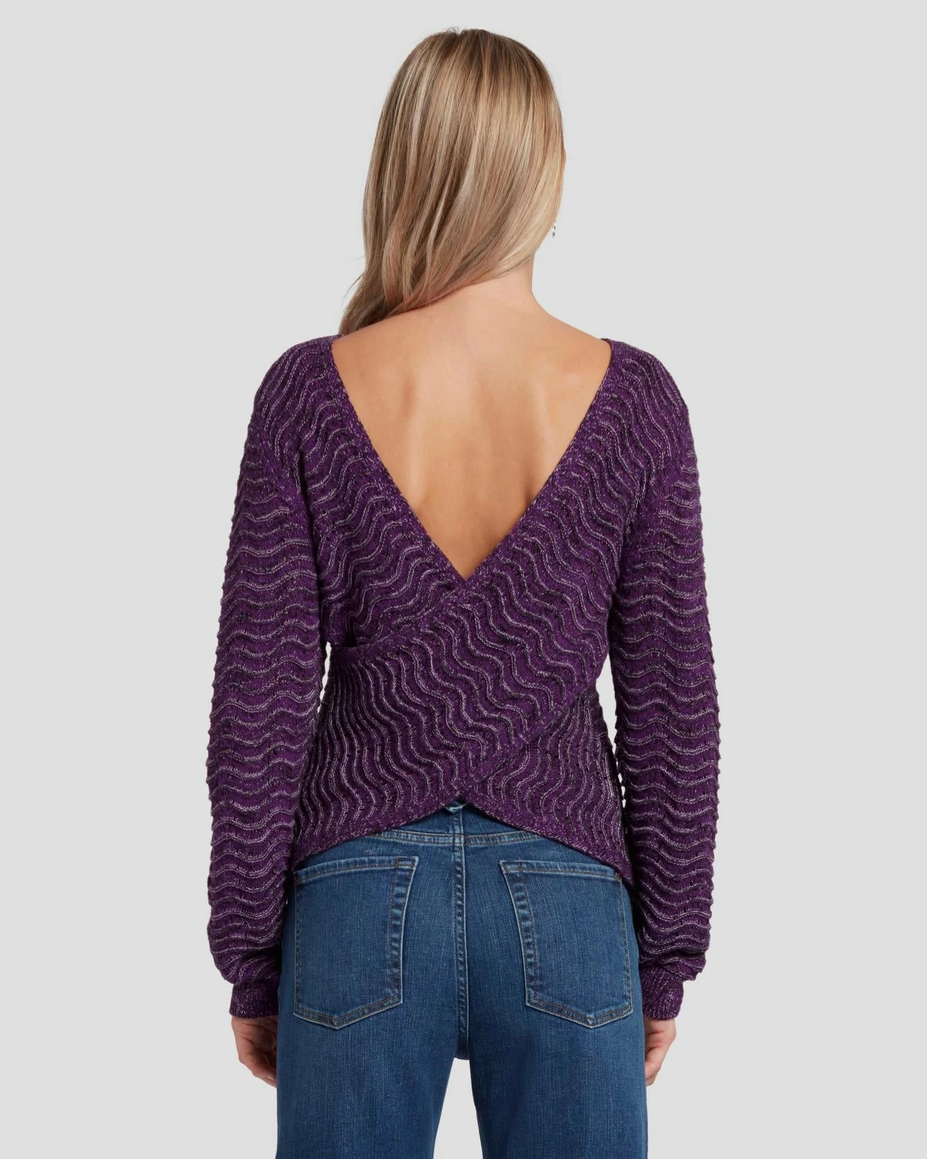 Add a little drama to your wardrobe. With its unique marled effect, rich purple hue and variegated stitching, this knit sweater stands out across the board. The deep criss-cross back will make sure you enter and exit a room in style.
