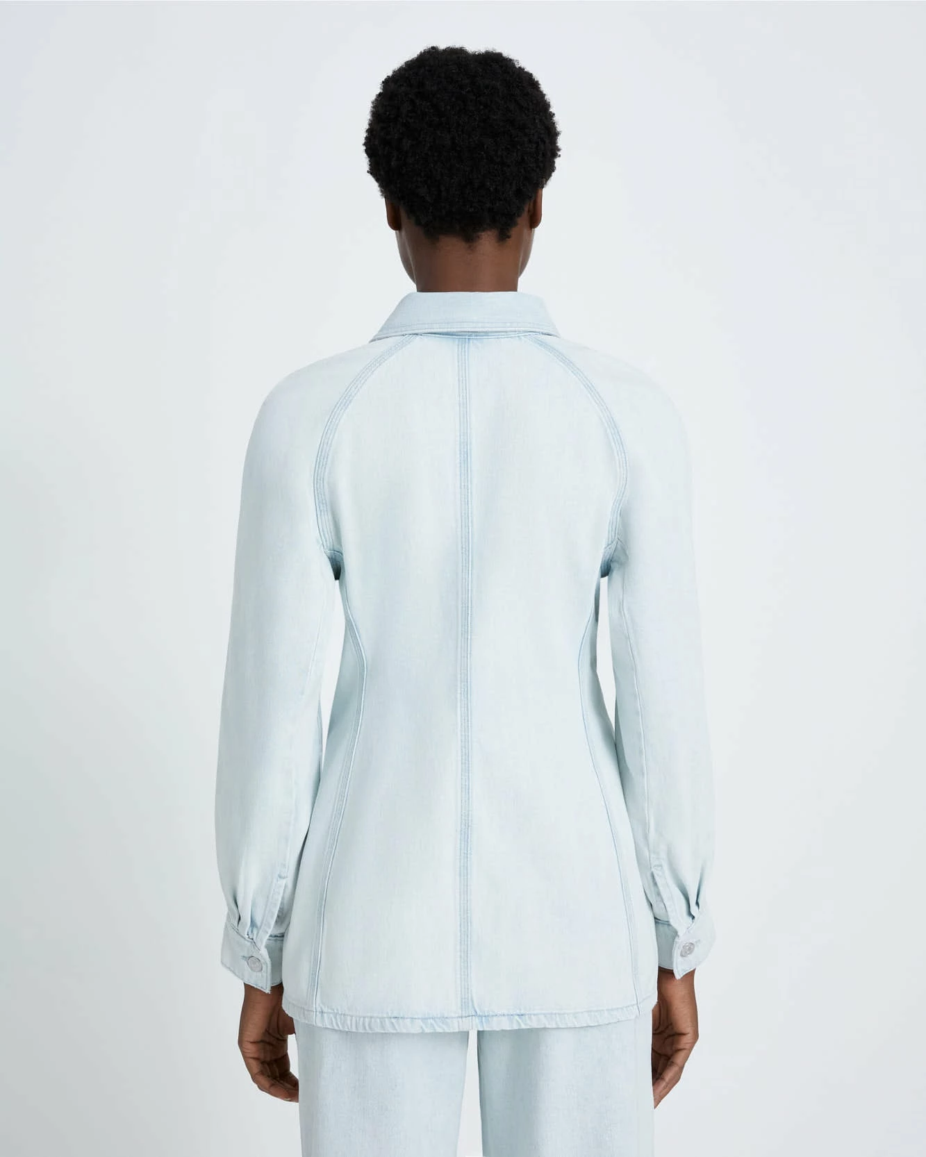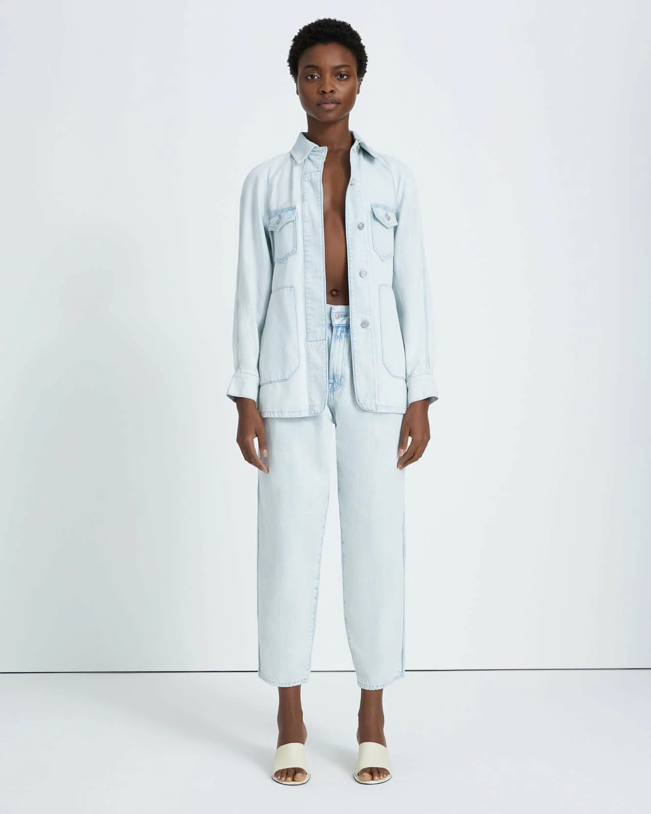 Inspired by utilitarian looks, this denim chore coat fuses modern tailoring and utilitarian-inspired touches. With patch pockets, classic topstitching, and a faded light wash this downtown-cool piece will toughen up any of your looks. Wear it on its own or as a jacket.