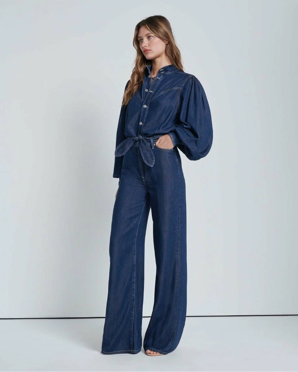 Our Denim Lustre collection is crafted from biodegradable and compostable fabrics for breathable long-lasting comfort and a super-soft hand feel. Our popular Jo wide-leg silhouette is transformed into an elegant jumpsuit. Western-inspired seaming and buttons are contrasted against feminine lantern sleeves. Crafted with a chic mock neck, an ultra high-rise waist and a cinched waist-tie, this women’s jumpsuit will be your new wardrobe favorite. One-and-done dressing made modern.