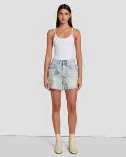 The perfect high-rise, button fly, denim shorts with an effortless fit. This pair of women’s denim is crafted from our signature premium denim with stretch in a light, sun-bleached wash with a raw hem, this pair of women’s jean shorts look like a perfectly worn-in vintage find. The luxe denim patchwork design elevates the look.
