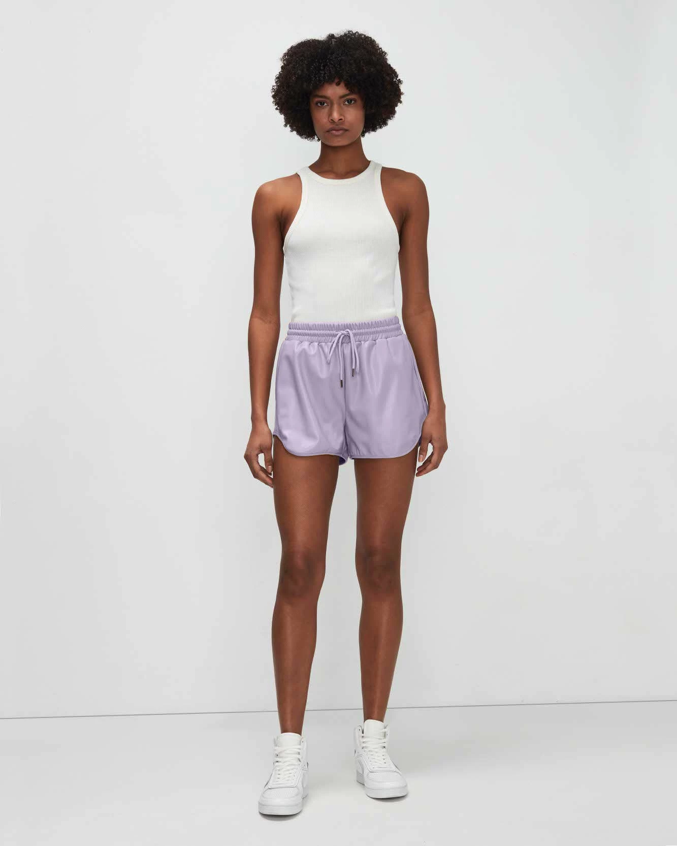 Dreamy, vegan faux leather creates a smooth, buttery backdrop for a chic pair of shorts. Elasticized waist with drawstring, stitched side slit hem, relaxed fit. Dress these up with a pointelle knit and button-up, or keep them casual with a boxy tee.