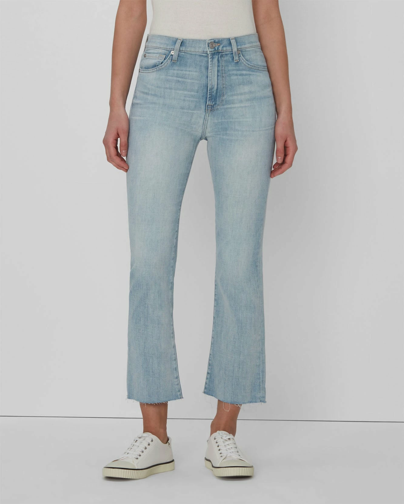 Our slim fit, cropped kick-flare silhouette with a high rise in a bleached blue wash. Crafted from our latest Left Hand Denim, featuring a reverse weave and ultra-soft feel to create your most comfortable jeans yet. Finished with a cut hem. Elevate this casual pair with a crochet knit.