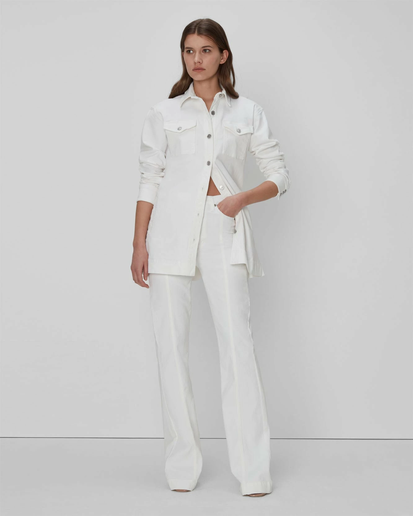 A chic interpretation of the 70s staple, this leisure jacket is all style. Sophisticated and simple, with a below the hip length, button front, side slits at hem, and a self-tie belt to cinch the fit. Wear it open or buttoned with a tonal ensemble to create the ultimate leisure suit. Crafted in comfort-stretch denim in summer-fresh white.