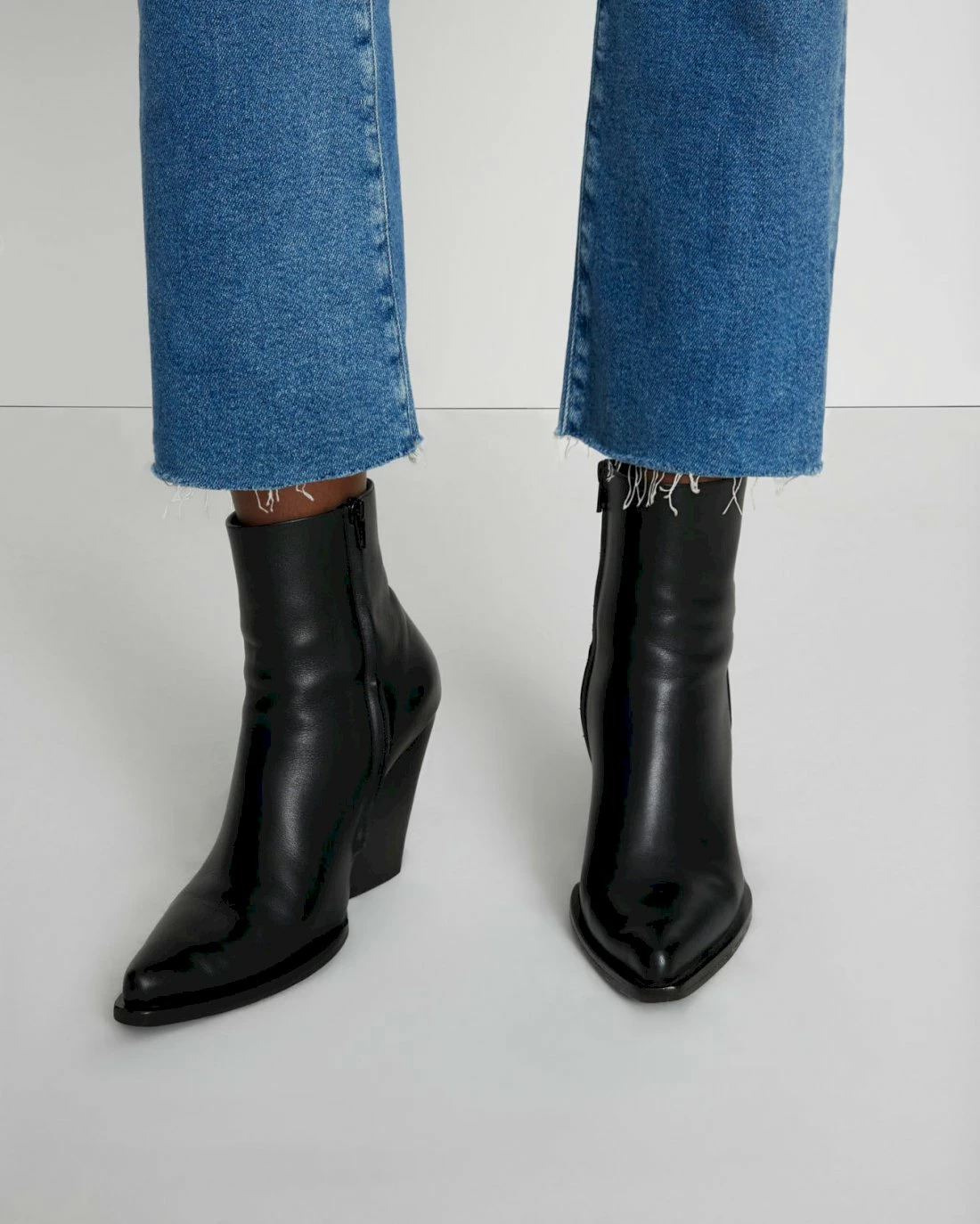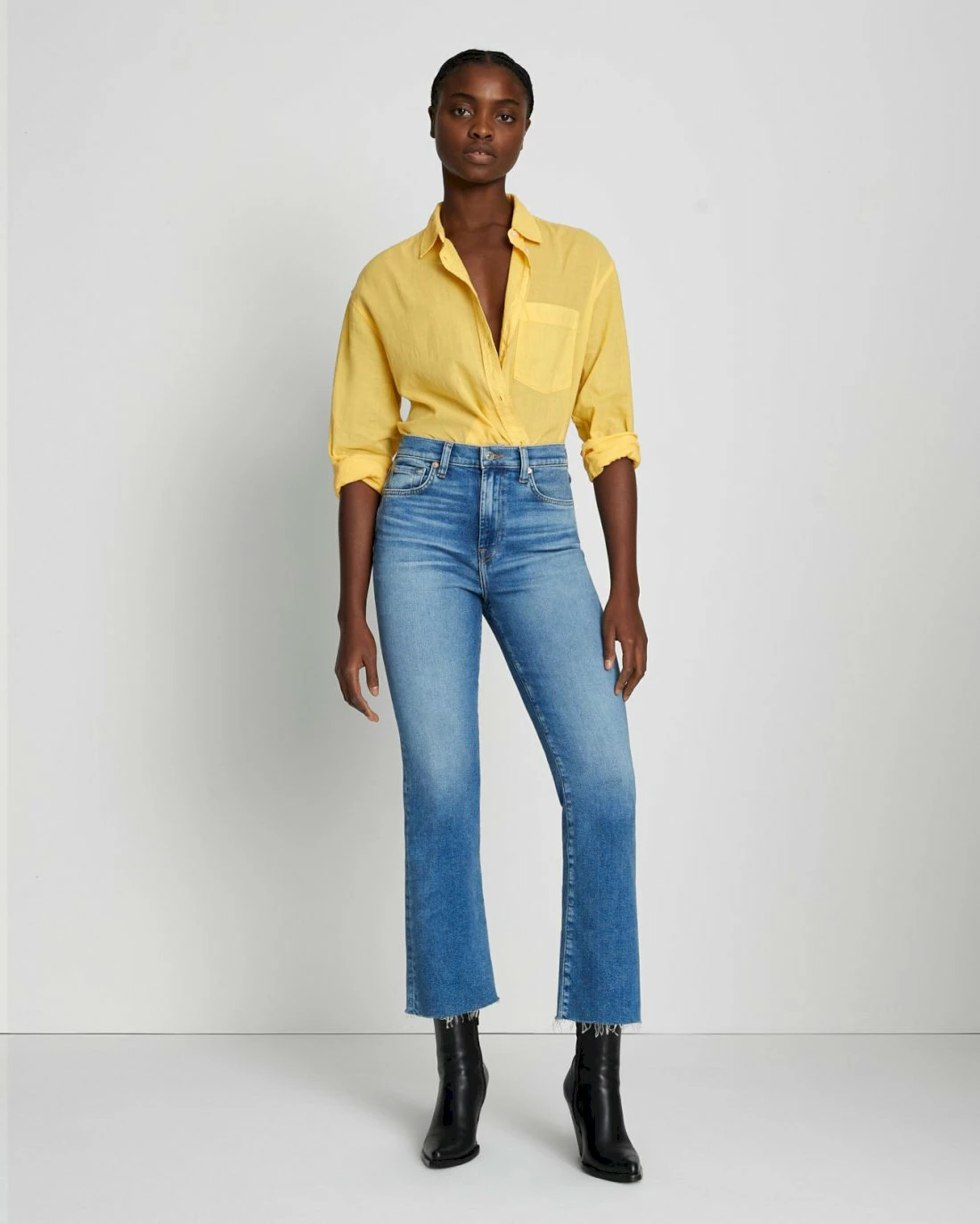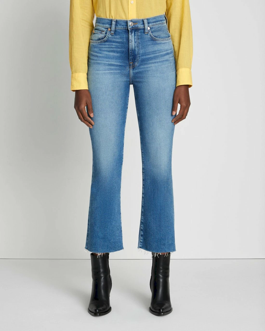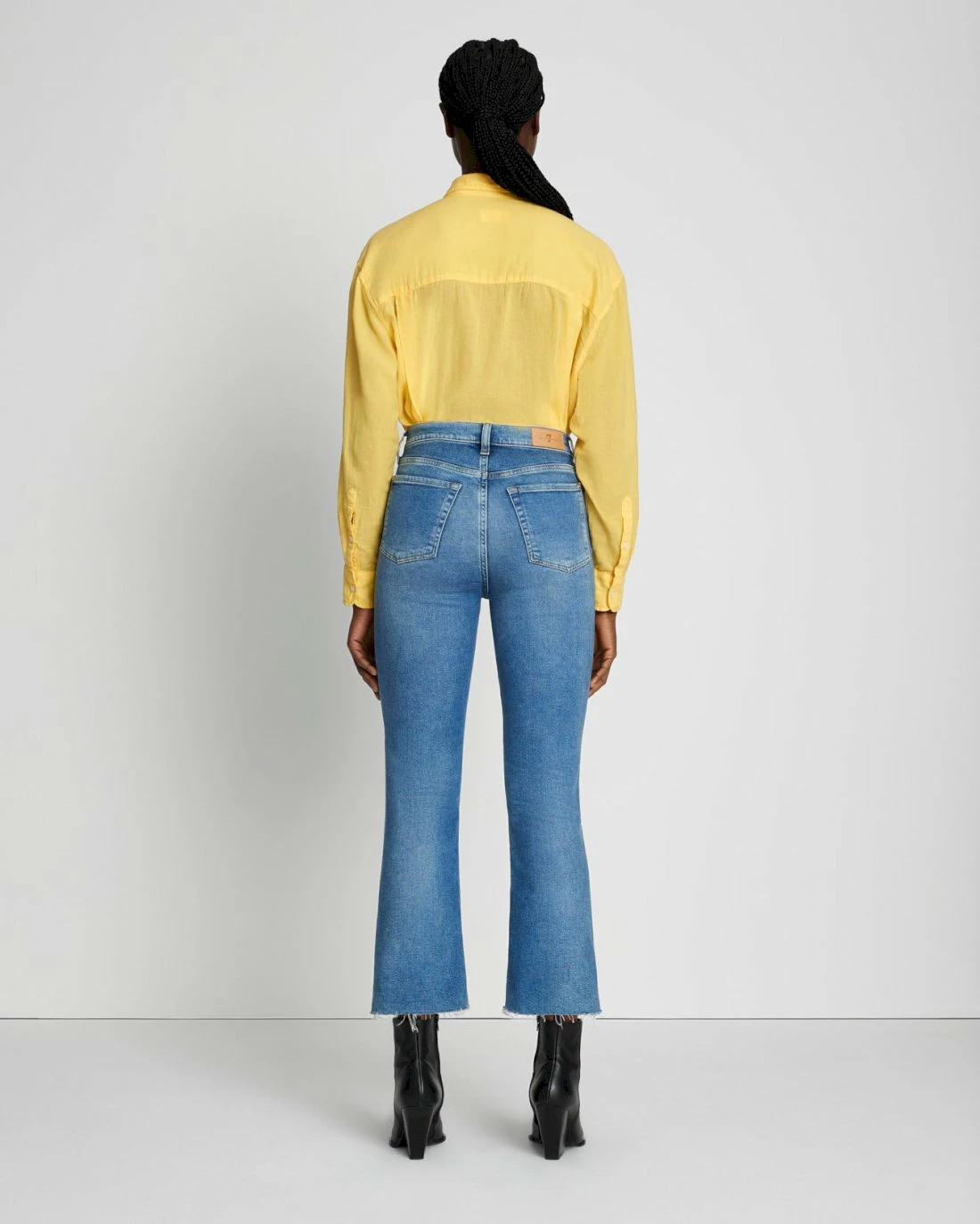 With its flattering cropped kick flare, meet our well-loved High Waist Slim Kick silhouette in a medium indigo wash with whiskering, fading, and a raw hem. Made from our signature Luxe Vintage, comfortable stretch denim with a vintage aesthetic. Perfect for showing off strappy heels or sleek boots.