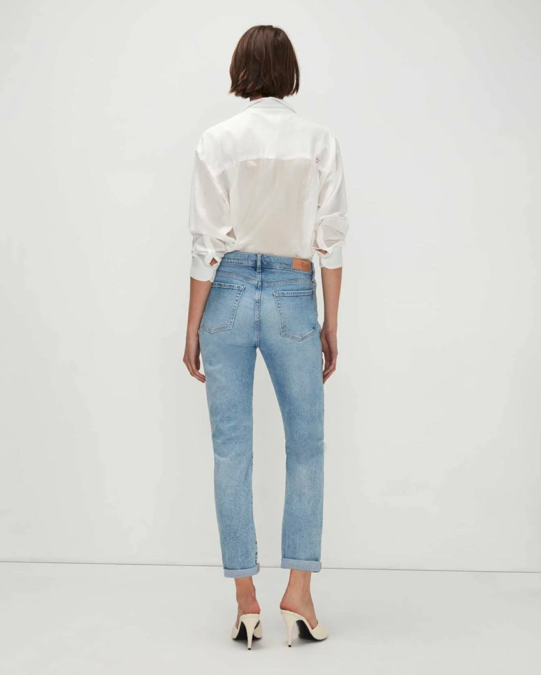 Our beloved boyfriend jean with a slimmed down silhouette gets warm-weather ready in a soft blue wash with a busted knee detail. Crafted from our signature Luxe Vintage denim, which combines a vintage look and the perfect amount of stretch, this wear-all-day pair is perfect with a tee and sneakers.