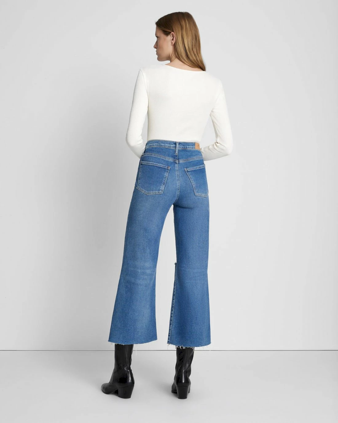 We borrowed our popular Dojo trouser silhouette and gave it an ultra-high rise and a cropped length. Crafted from our signature Luxe Vintage denim, which combines a vintage look and the perfect amount of stretch. This pair has a medium indigo wash with natural whiskering, a fade down the thigh, and a raw hem. Well-placed destruction at the knee keeps your look effortless no matter how you style it.
