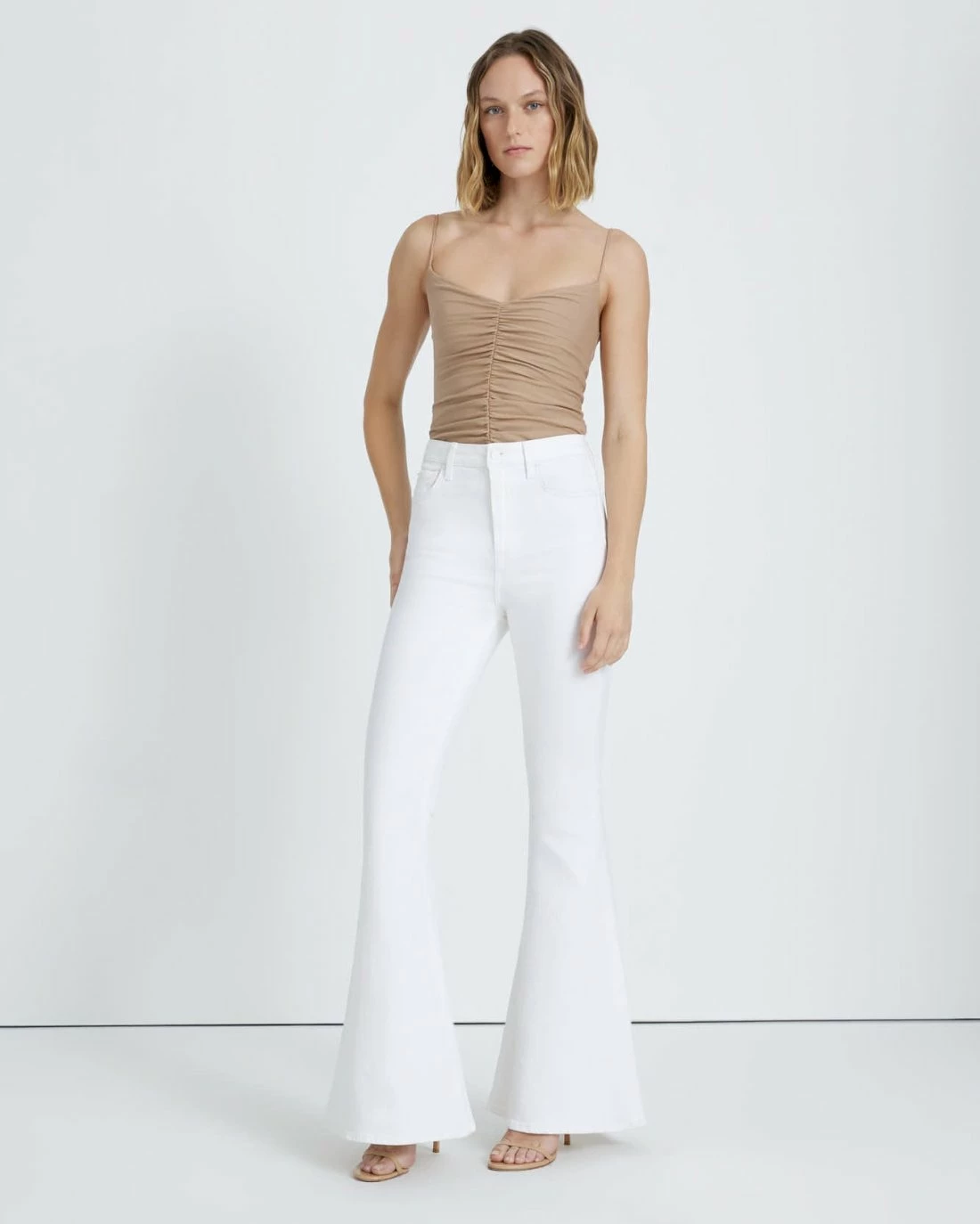 These bright white, ultra high-rise, jeans make an impression. With a 70s-inspired silhouette this pair is fitted through the hips and thighs, and the elongating leg leads to a bold flare. The clean white, medium-stretch denim will be your new all-year-around favorite.
