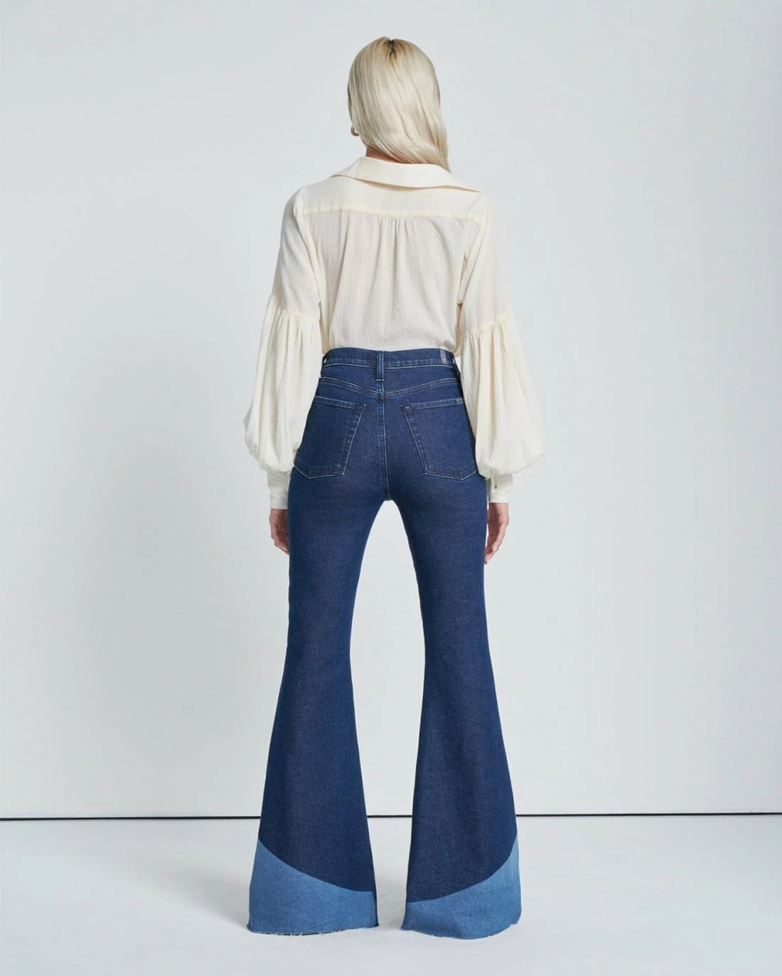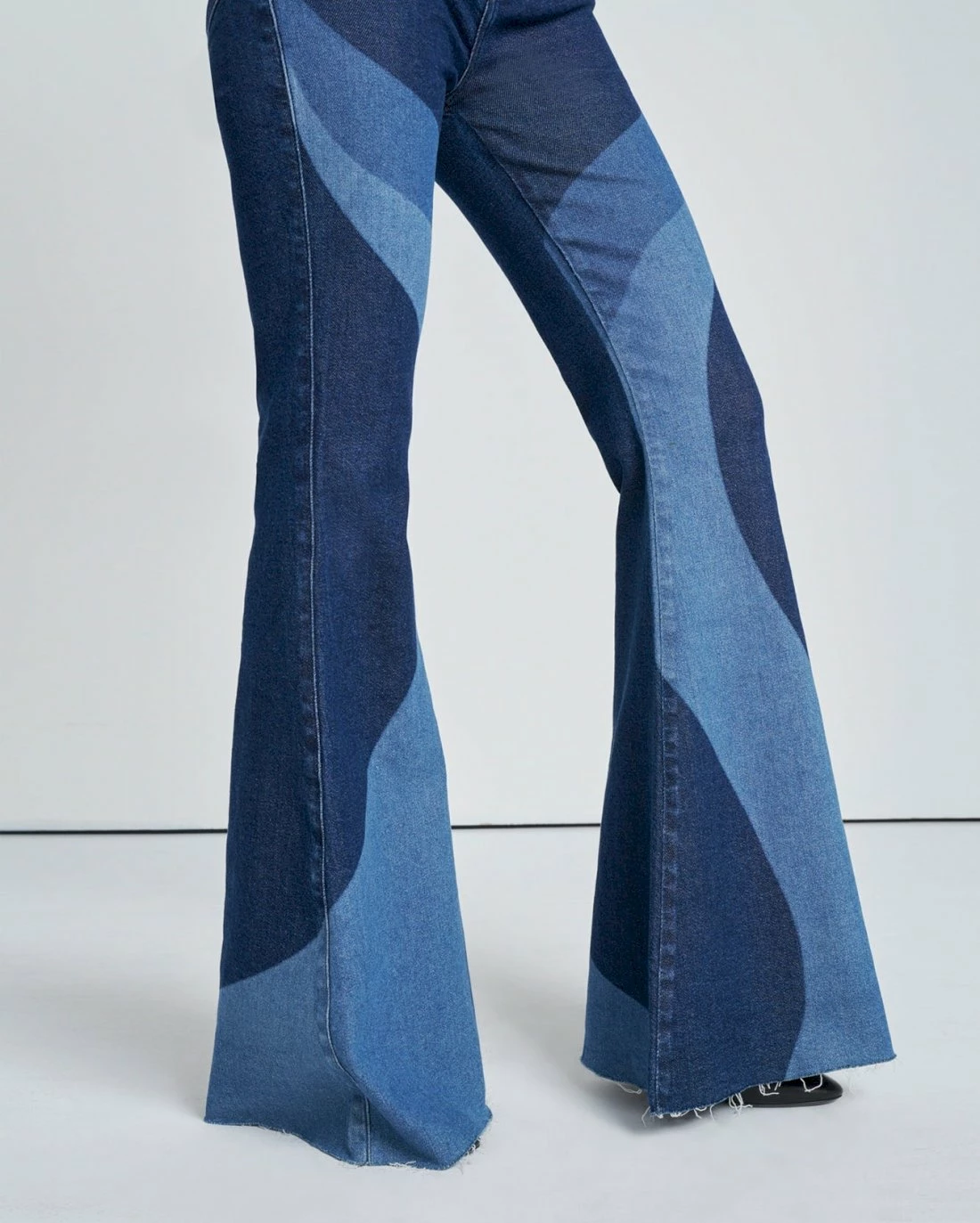 Our ultra high-rise fashion jean makes an impression. With its 70s-inspired silhouette and medium stretch fabrication, this showstopper is fitted through the hips and thighs with playful patchwork that leads to a bold flare.