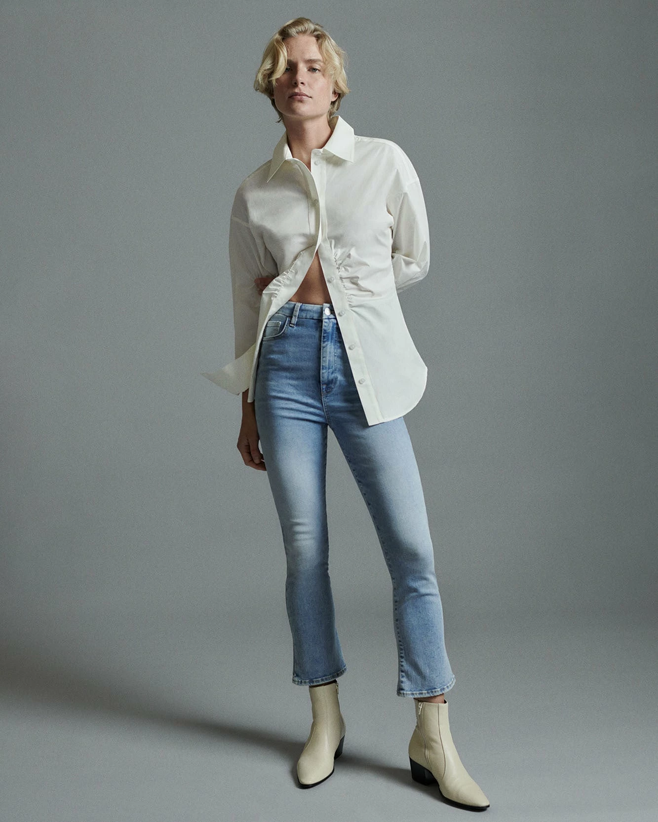Designed with a slim fit and a cool, cropped kick-flare silhouette, these ultra-high-rise jeans are a wardrobe staple. Made from our No Filter denim offering extra stretch, shape, and softness – inspiring your most confident look yet, no filter required. The light indigo wash with whiskering in all the right places makes them easy to wear with everything from tees to blouses.