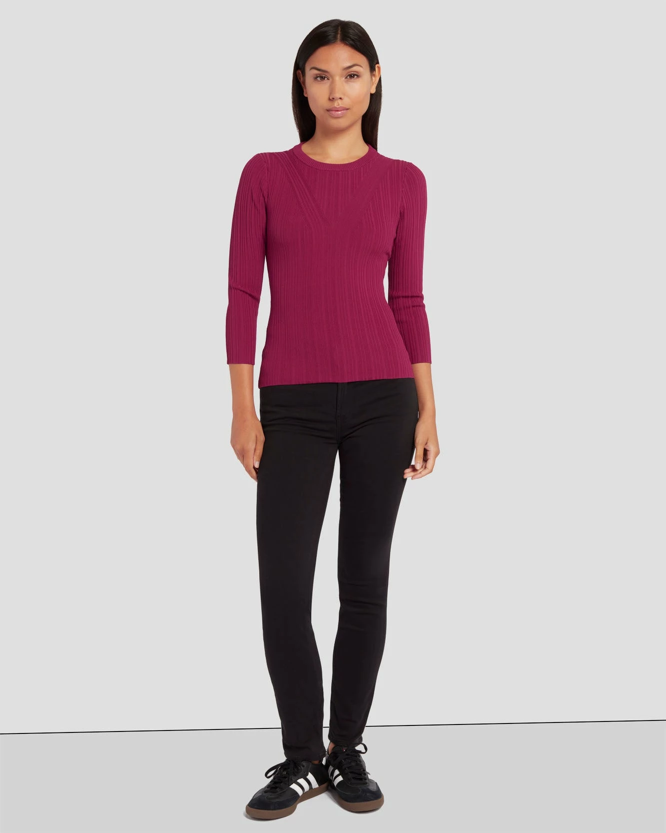 Make a statement. Featuring 3/4 sleeves, this slim-fitting knit top has delicate ribbed detailing and stitchwork to add contour and dimension. Dramatic back cut-outs set this top apart from the rest.