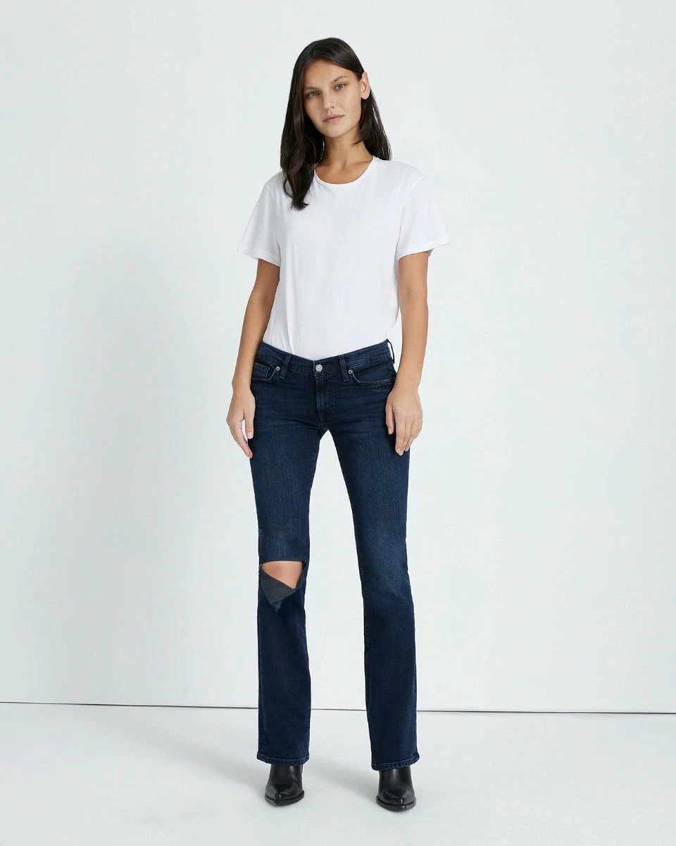 Our best-selling original bootcut reinvented. Done in a dark wash with light whiskering and cut from medium stretch denim for all-day comfort. Its low-rise silhouette is finished with an unexpected ripped knee for a worn-in look.