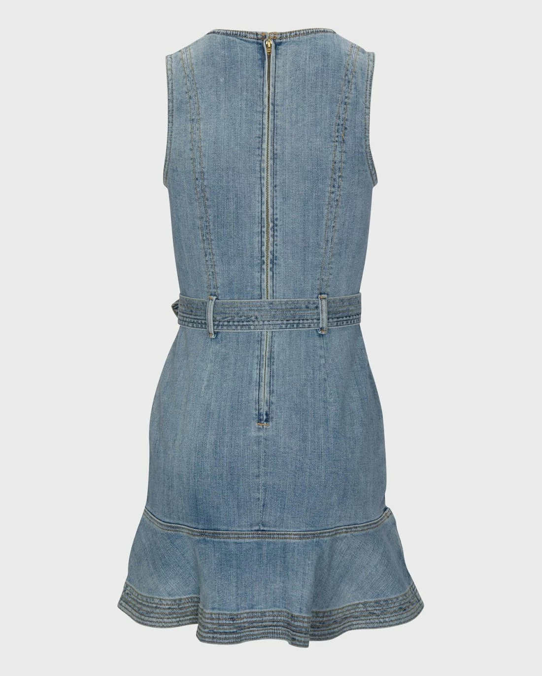 Super soft denim in a light wash sets a casual backdrop for a fitted silhouette dress. V-front, sleeveless, seamed construction, patch pockets, belted waist and a flirty ruffle hem. Great for day to night and season to season. Layer over a ribbed top and tights for those cooler months.