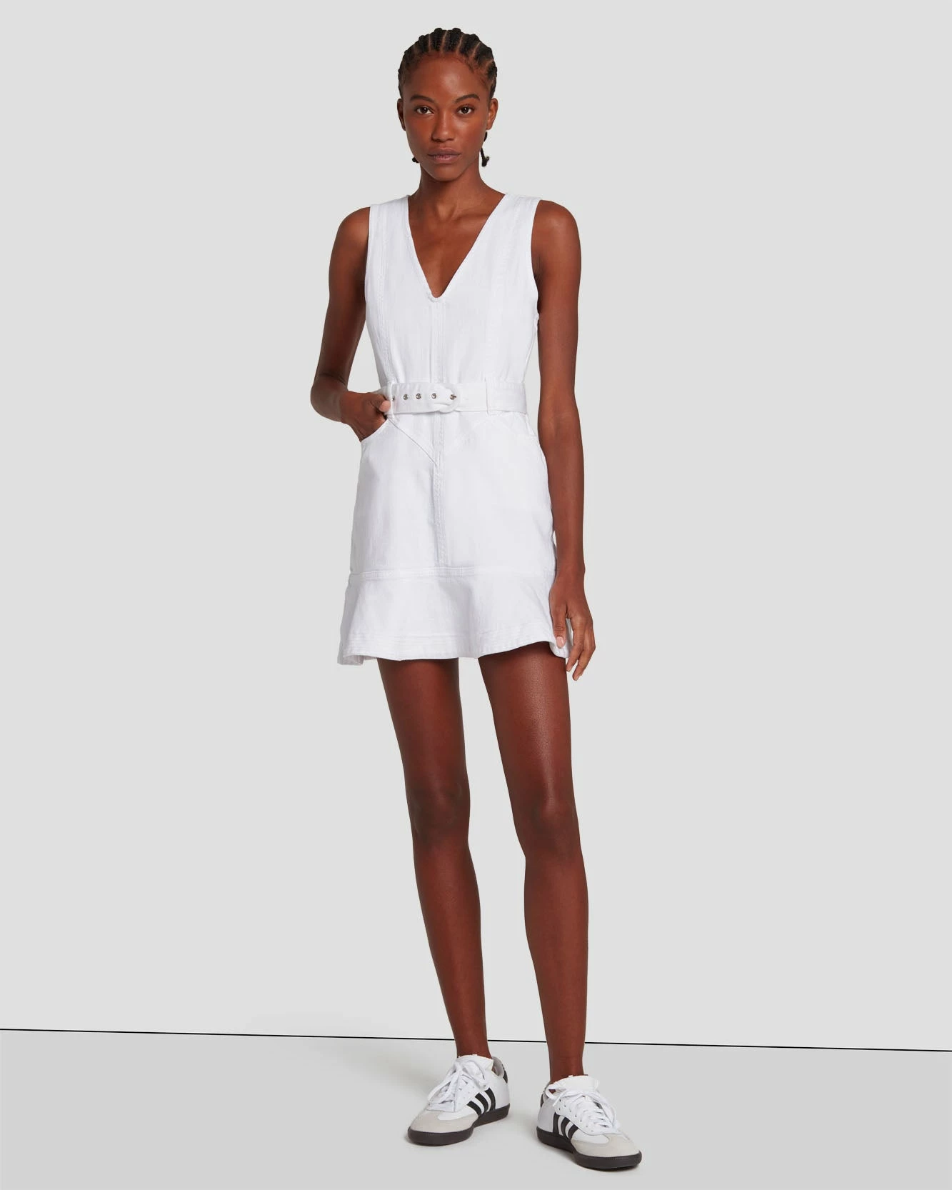 Refresh your look with this all-white belted dress with patch pocket detailing. With a v-neckline and mini dress length, this dress will create long lines on everybody. Designed in a soft, comfort denim for all-day wear this white dress will see you through any moment. Pair this women’s dress with your favorite sandals for an instant outfit.