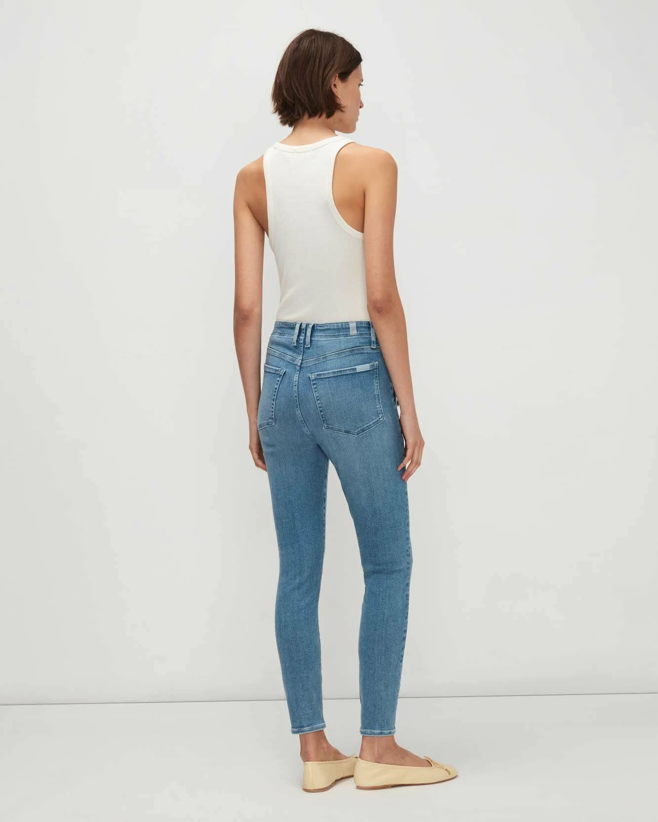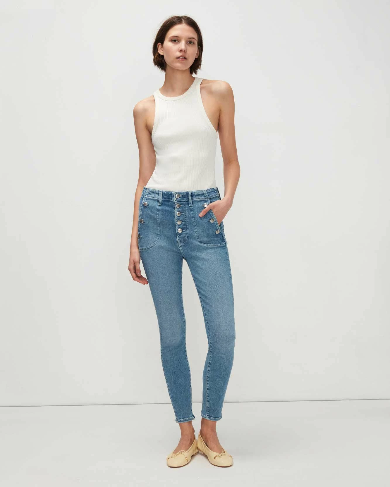 Our highest rise skinny jean sits way above the waist and is finished with a sleek, skinny leg. Crafted in our signature premium denim with stretch in a soft blue wash, punctuated by an exposed button fly and exposed button slant pockets. Pair with a fitted, tucked top to make the most of an elongated silhouette.