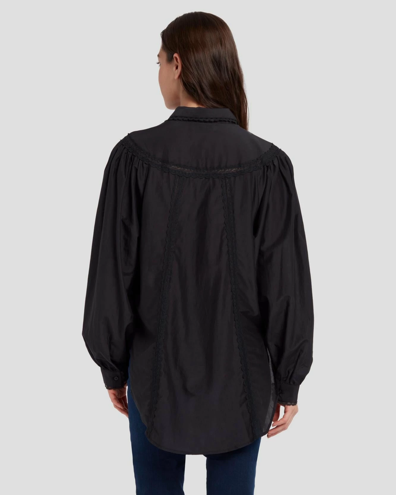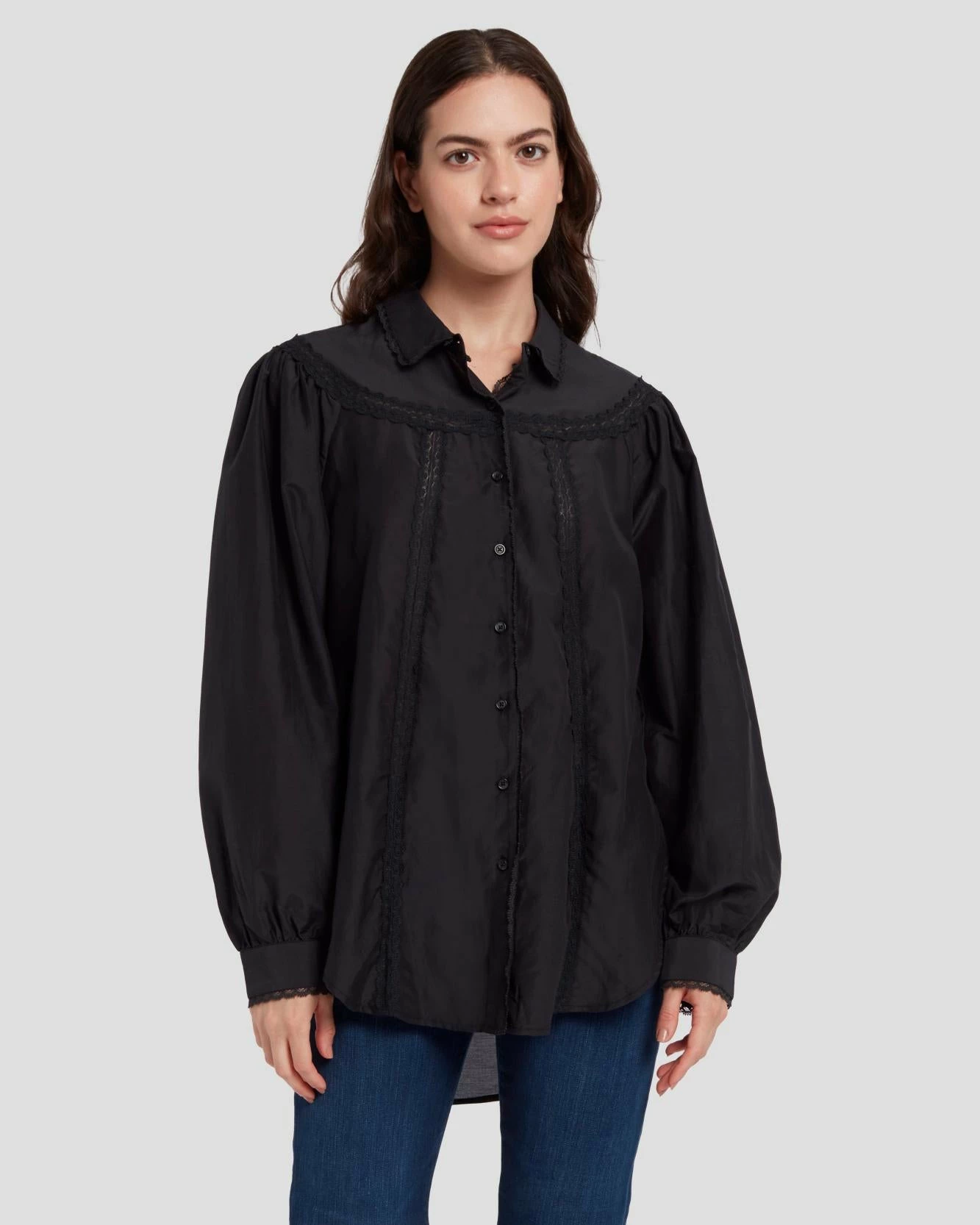 With flirty lace insets and trim on the cuffs and collar, this prairie blouse will add a touch of whimsy to your denim looks. The slightly oversized fit and subtle lantern sleeves give a relaxed, flowy finish.