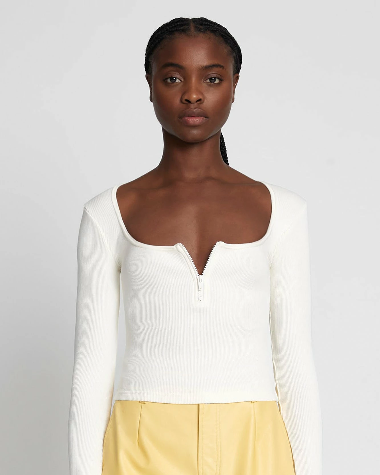 This fitted, long-sleeve top in our compact ribbed knit has a flattering square neckline and cropped length. The front zipper detail adds interest. Zip it all the way up -or down- depending on the day.