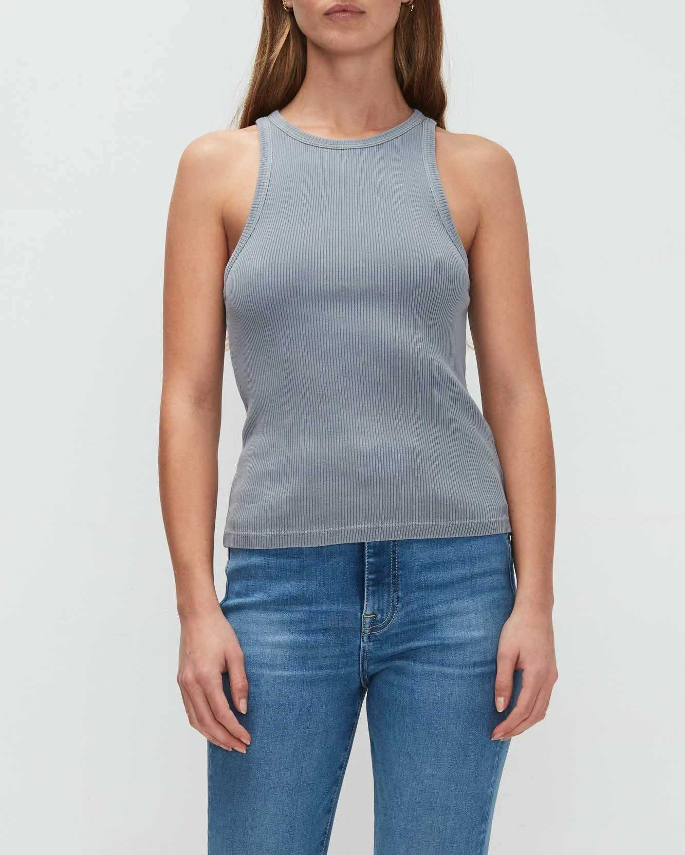 Offered in a subtle hue, our finely ribbed tank features a shoulder baring, racer back. This super soft essential is the perfect layering companion, or wear solo with your cutoff shorts for those days in the sun.
