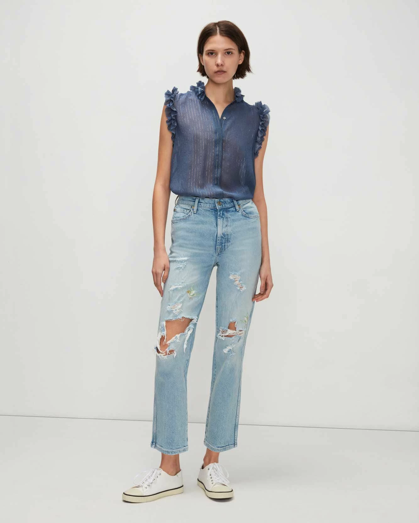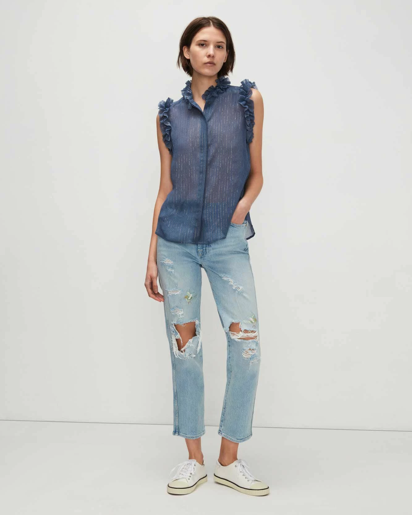 Be the first to review “7 For All Mankind Sleeveless Lurex Stripe Ruffle Collar Shirt In Denim Blue” Cancel reply