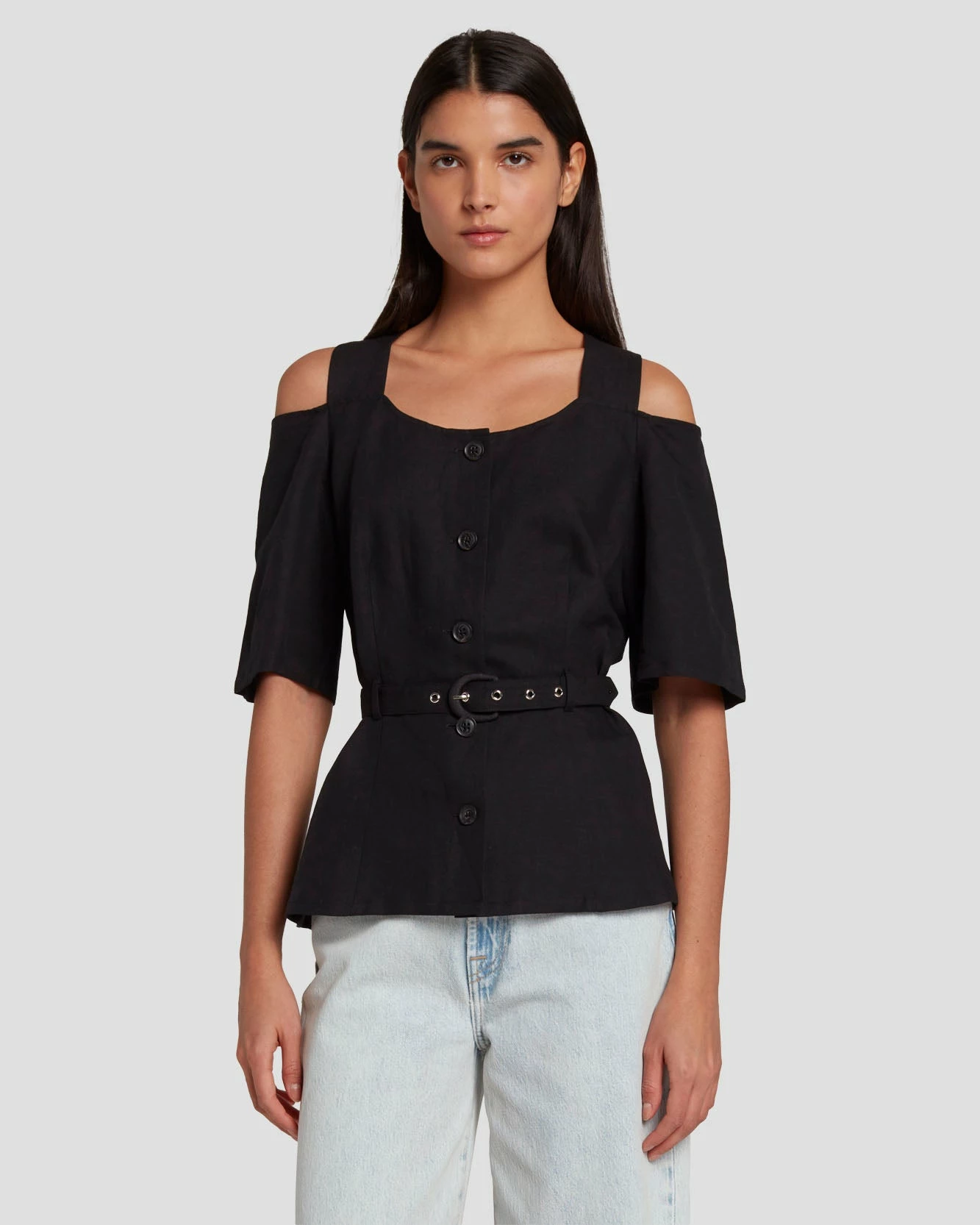 Both lightweight and sleek, this woven top is the perfect option for warmer weather. With feminine shoulder cut outs, front buttons and an adjustable belt at the waist, this women’s top can be paired with your favorite jeans or shorts for an instant outfit.