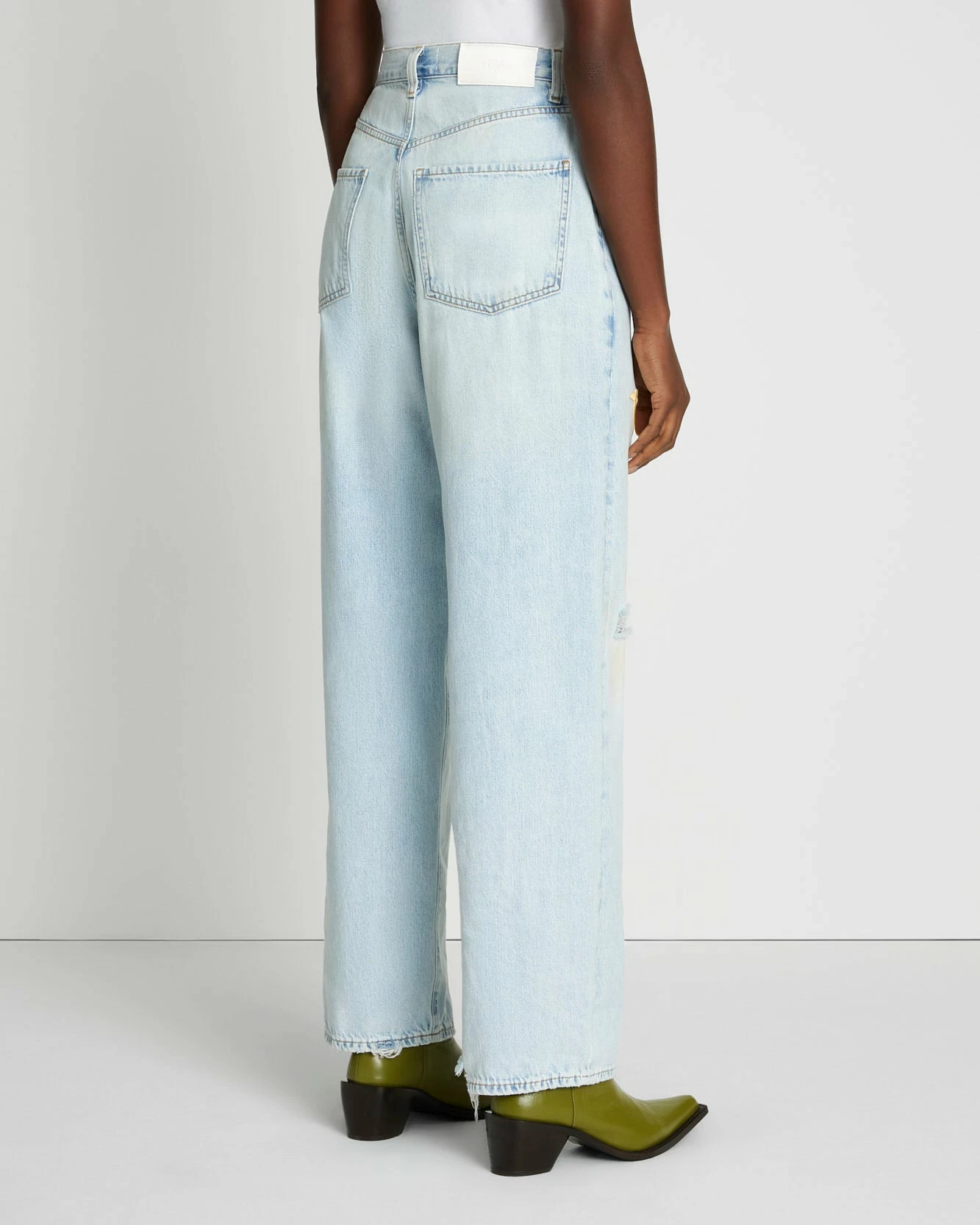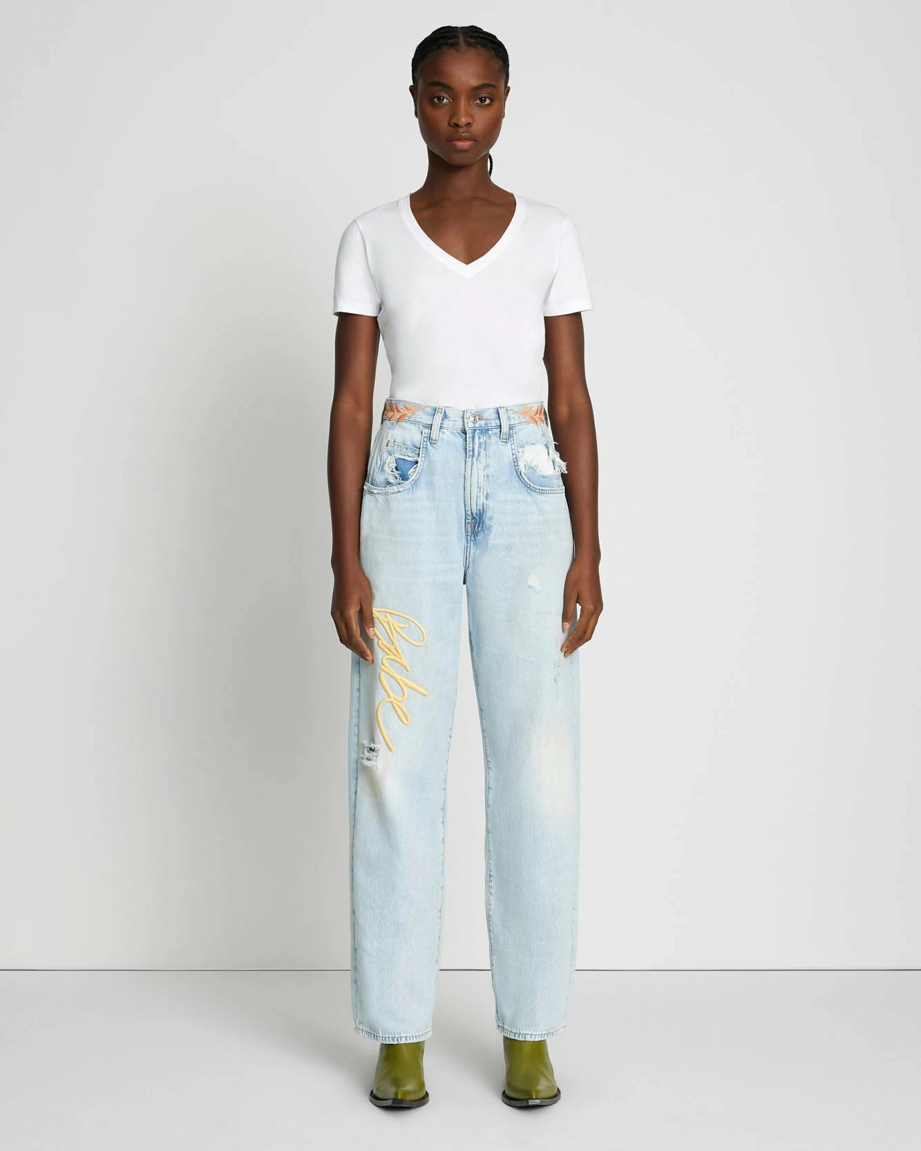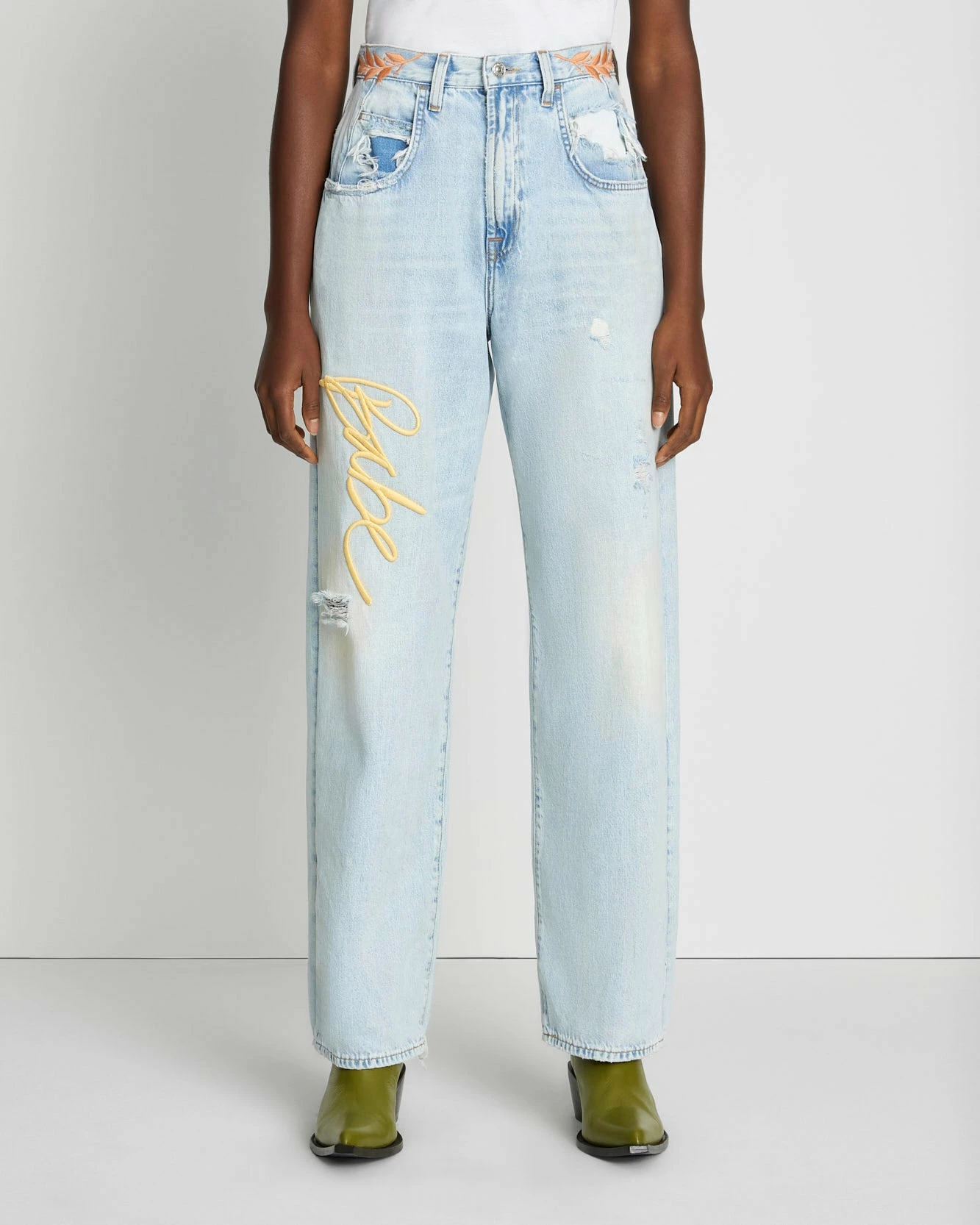 Consider this fit a 90s flashback made modern. These jeans are all attitude, with a pinched high waist, baggy legs, exaggerated pockets, and a subtly tapered hem. Crafted from rigid denim in a light blue wash, the luxe embroidered details juxtapose nicely with the heavy fading, distressed front pockets, and grinding at the hem. Elevate your look with a sleek blazer or pair with a tee for a cool, casual vibe.
