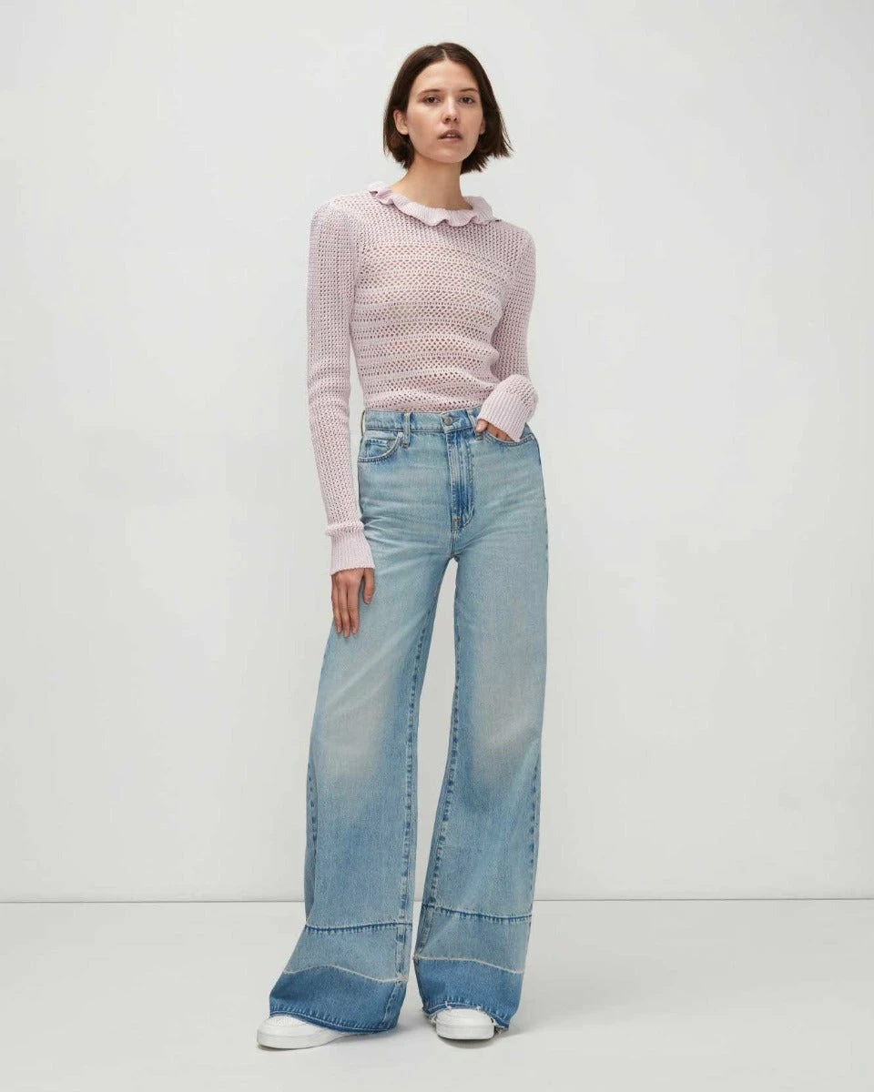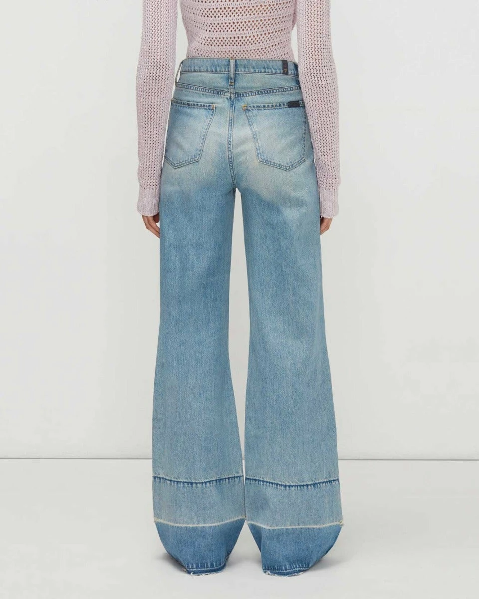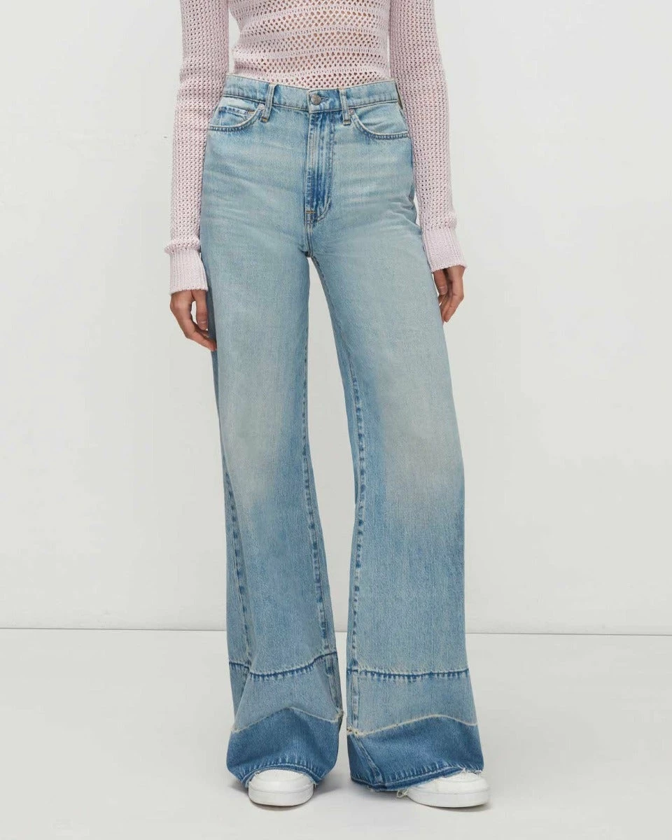 An ultra high rise and super wide-leg offer the best 70s silhouette, while our super soft, rigid denim delivers authentic style. A powdery blue wash is finished with hand sanding and a released hem. Keep your look nostalgic with a fitted tee.