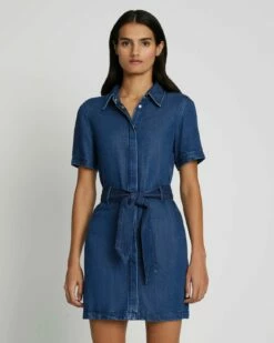 7 For All Mankind Denim Lustre Belted Shirtdress In Dark Indigo
